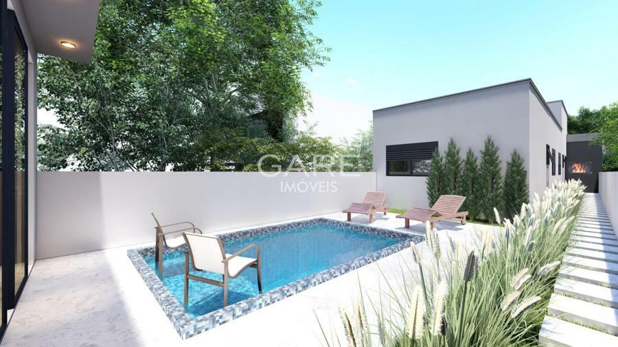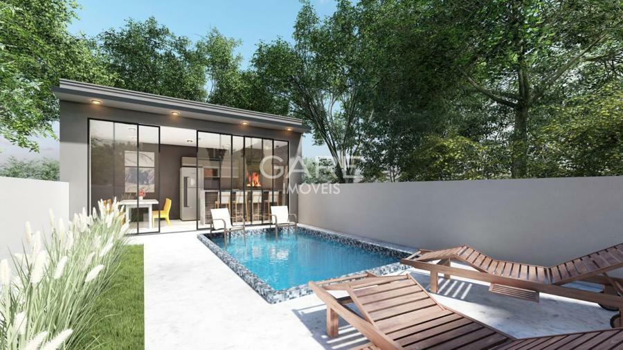 02 dormitórios + 1 suite, piscina em concreto, área social com pé direito duplo, muros laterais.
