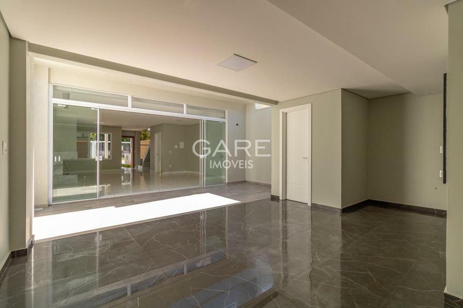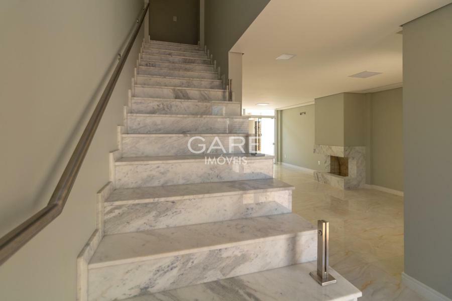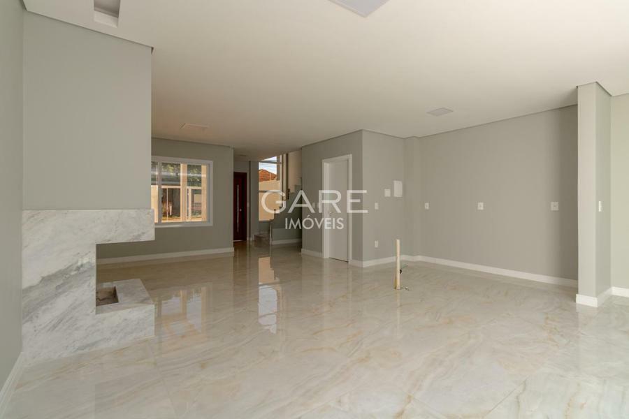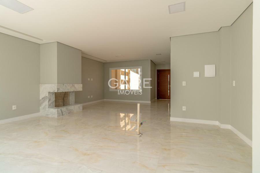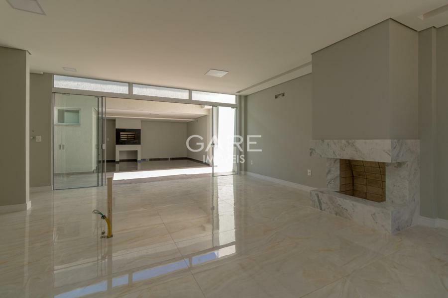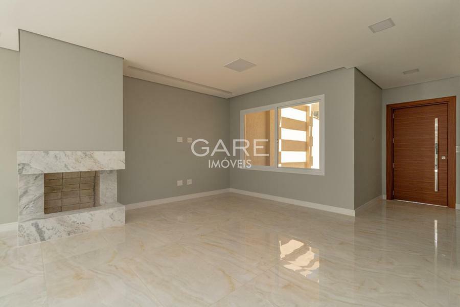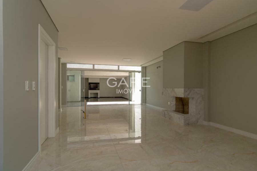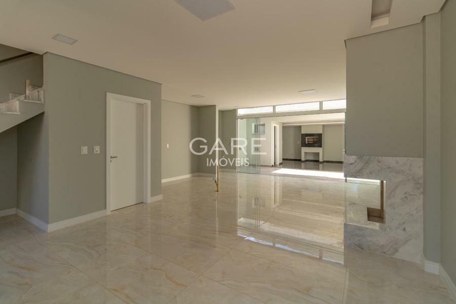Piso inferior com sala de estar com lareira, cozinha, área de serviço e lavabo.