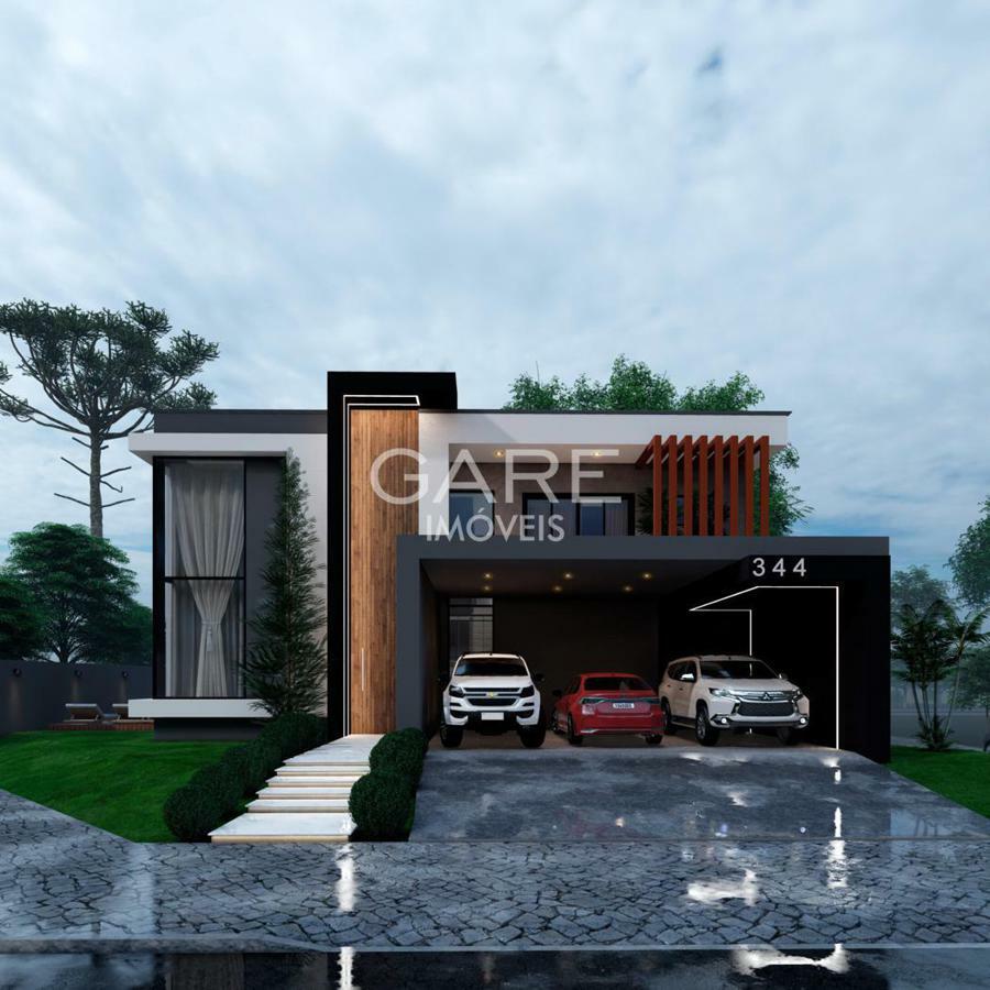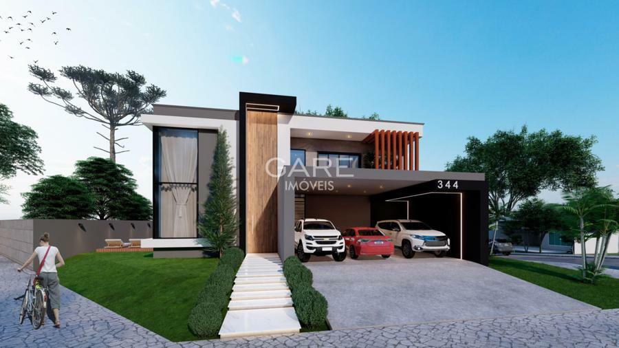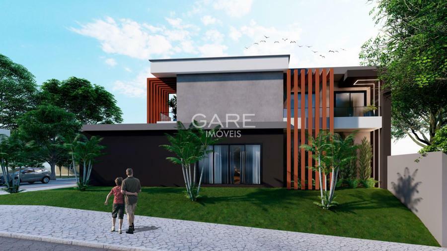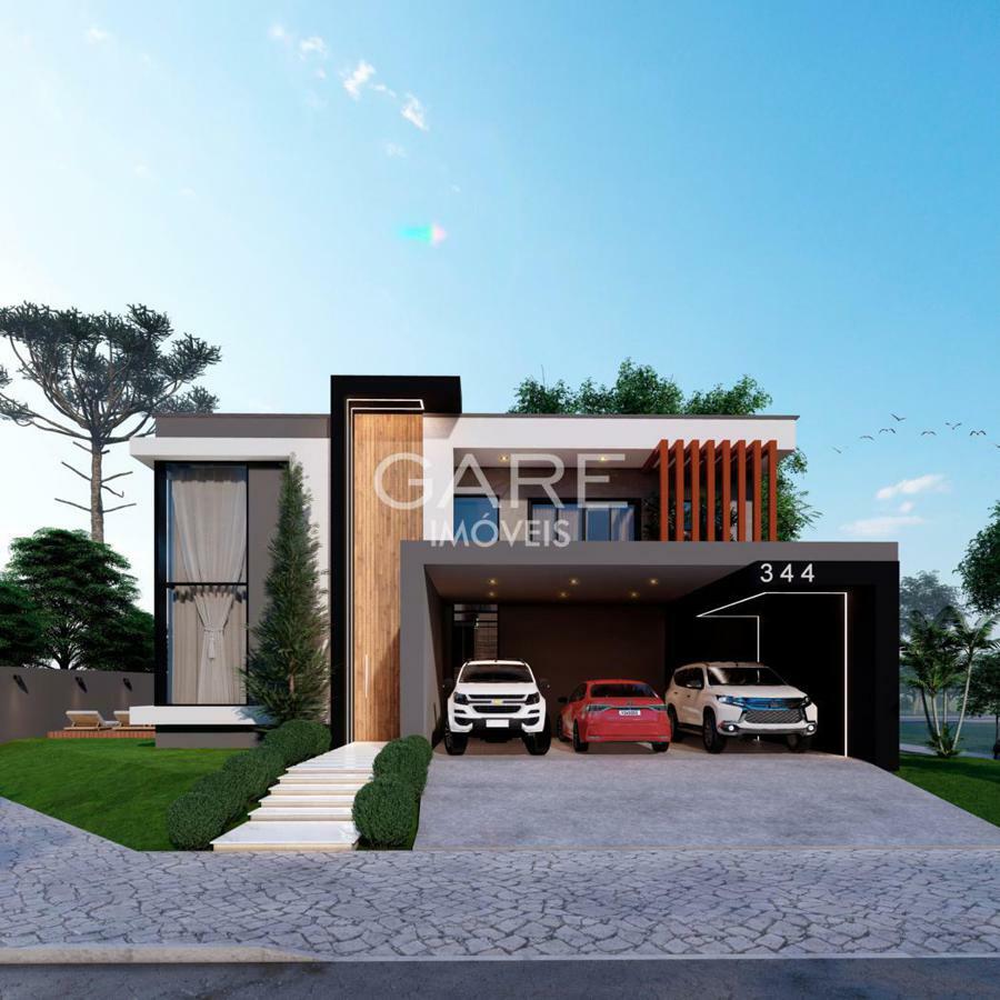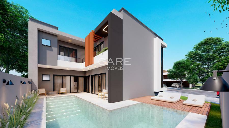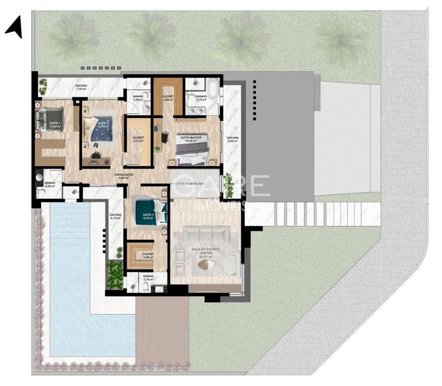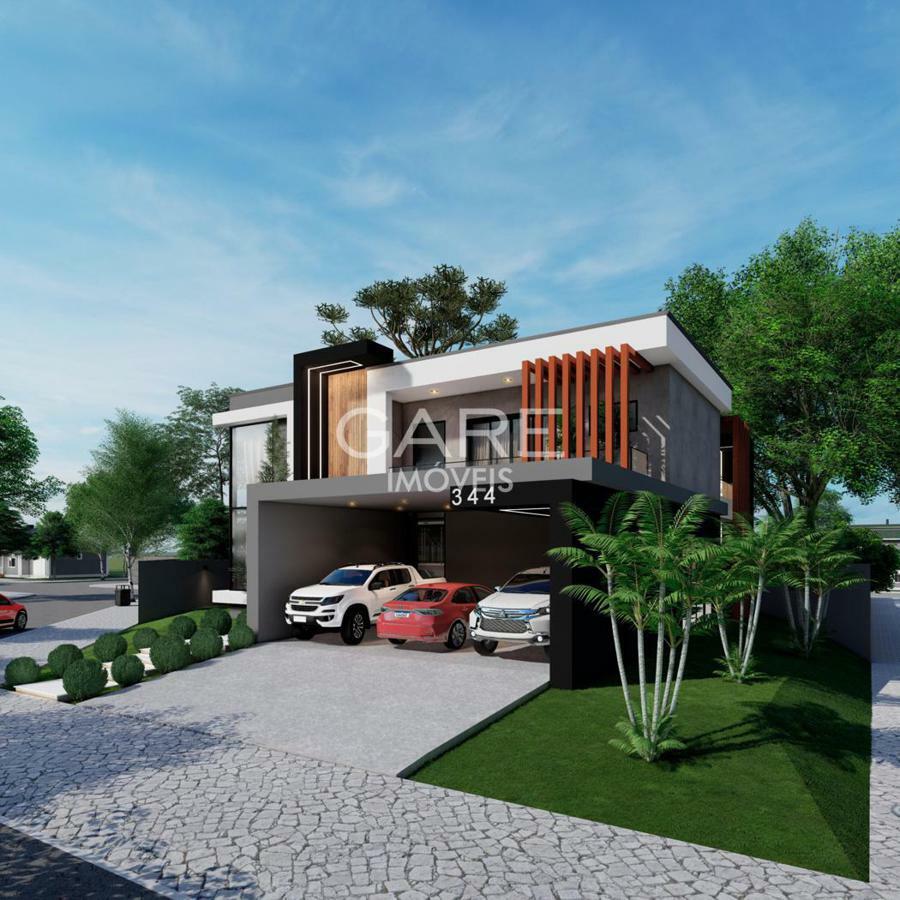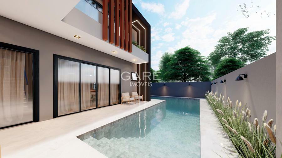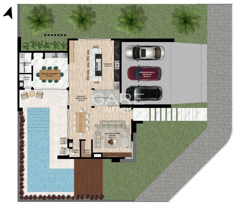 Projeto no térreo com 3 vagas de garagem, sala de estar e jantar, cozinha, adega, lavabo e no pátio espaço gourmet, lavanderia, lavabo e piscina.